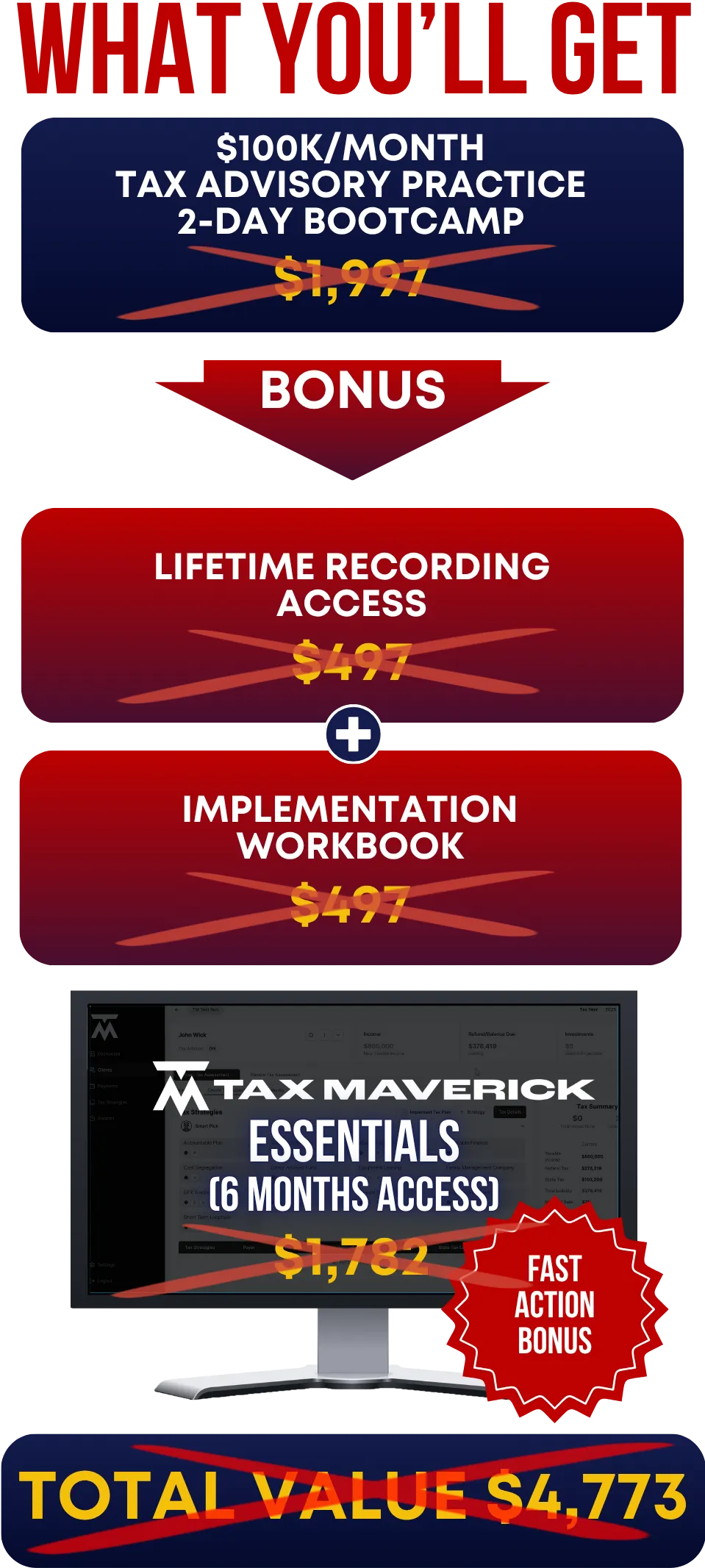This workshop is unique because it’s action-oriented. We don’t just teach theory; we give you the exact blueprint for landing clients, creating tax plans, and scaling your business. With the hands-on guidance, templates, and software, you’ll be ready to implement everything you learn right away. Plus, you’ll leave with a ready-to-use tax plan and client acquisition strategies, so you’re equipped to succeed immediately.